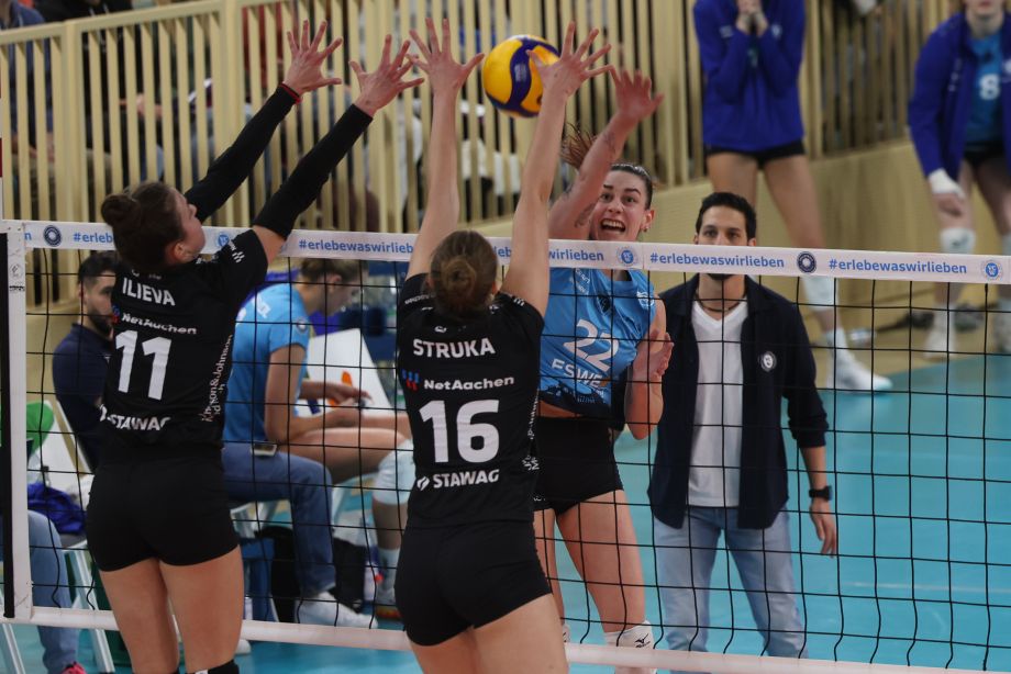 VCW-Chefcoach Tigin Yağlioğlu: „Das war ein Spiel, das sehr weh tut. Wir haben einen grandiosen Start und auch einen durchaus guten zweiten Satz geliefert, der dann aber an Aachen ging. Der Einschnitt nach Rene Sains Ausfall war schon sehr groß, weil viel auf sie ausgerichtet ist. In so einem bitteren Fall muss man sich neu einstellen und wieder ins System finden. Ein 24:26 zeigt aber auch, dass die taktische Umstellung eigentlich funktioniert hat. Leider waren es dann einige Fehler zu viel. Schade, denn wir waren knapp dran, noch in den Tiebreak zu kommen. Ich bedanke mich aber ausdrücklich bei meinem Team. Jede Athletin hat alles gegeben. Und auch unserem tollen Publikum möchte ich danken, das war heute eine mega Stimmung in der Halle.“