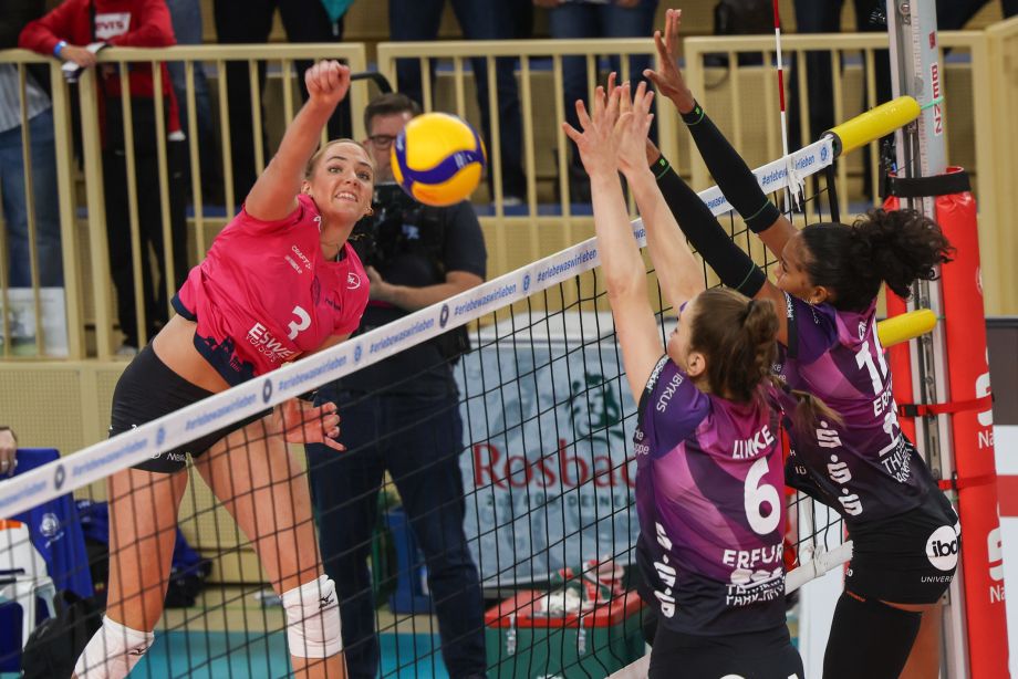 Der VC Wiesbaden reist nach Thüringen, wo am Freitag (23.1.2026; 18:00 Uhr) die Partie gegen Schwarz-Weiß Erfurt in der Riethsporthalle auf dem Spielplan steht. Drei Partien gilt es bekanntlich innerhalb einer Englischen Woche zu bestreiten. Nach dem Sieg gegen Borken (3:0) und der empfindlichen Niederlage gegen den Dresdner SC am Mittwochabend (0:3) peilen die Hessinnen nun weitere Punkte an, um als derzeit Siebter (17 Punkte) der 1. Volleyball Bundesliga Frauen den Anschluss an die Ladies in Black Aachen und den USC Münster möglichst zu verkürzen. In der Woche darauf reist man dann zum Liga-Neuling Binder Blaubären TSV Flacht nach Baden-Württemberg (Sonntag, 1.2.2026, 18:00 Uhr). Auch dort ist ein Sieg eingepreist.